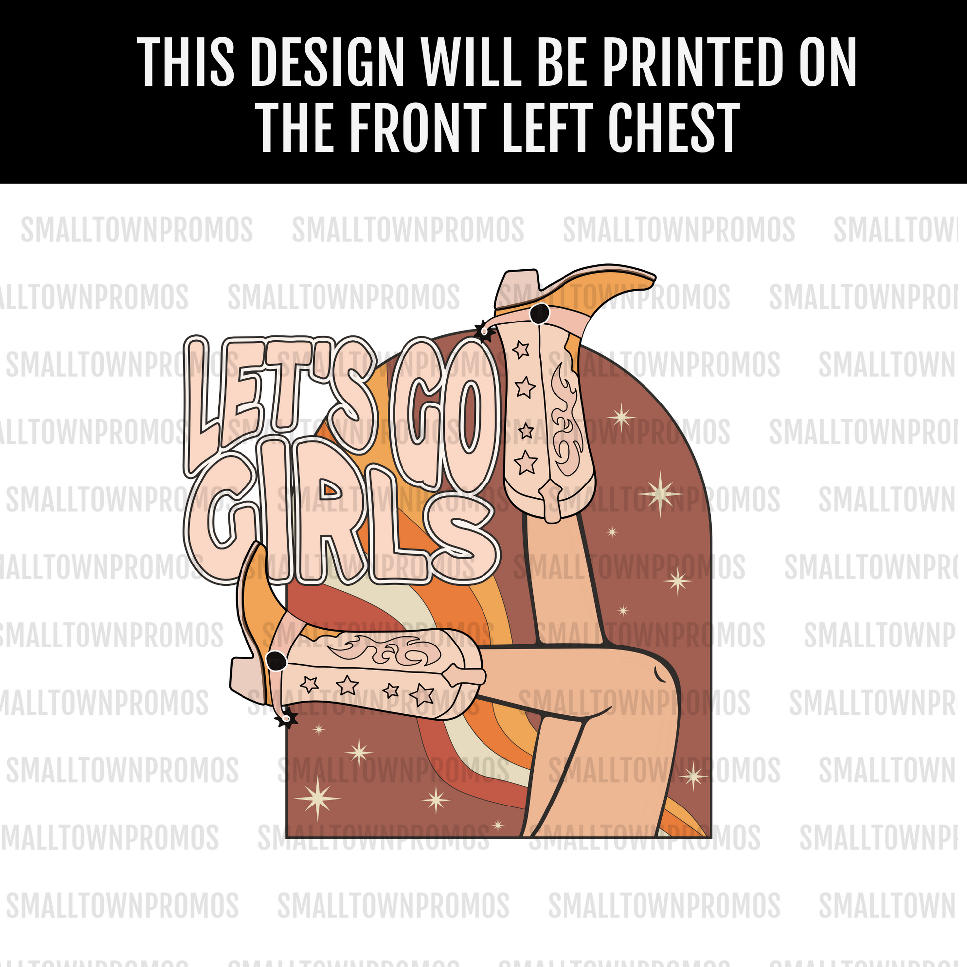 Let's go girls!! It's a full color design printed on the front left chest of the shirt.